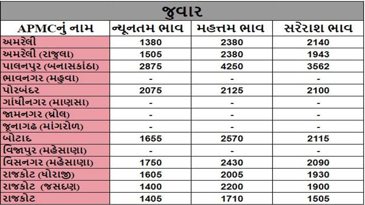 જુવારના તા.24-12-2021ના રોજ APMCના ભાવ રૂ.1380 થી 4250 રહ્યા.