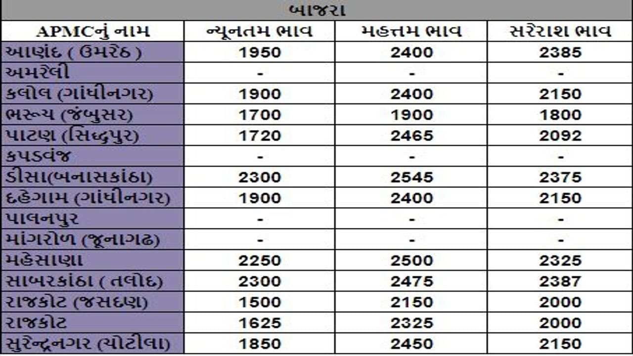 બાજરાના તા.29-08-2022ના રોજ APMCના ભાવ રૂ.1500 થી 2465 રહ્યા.