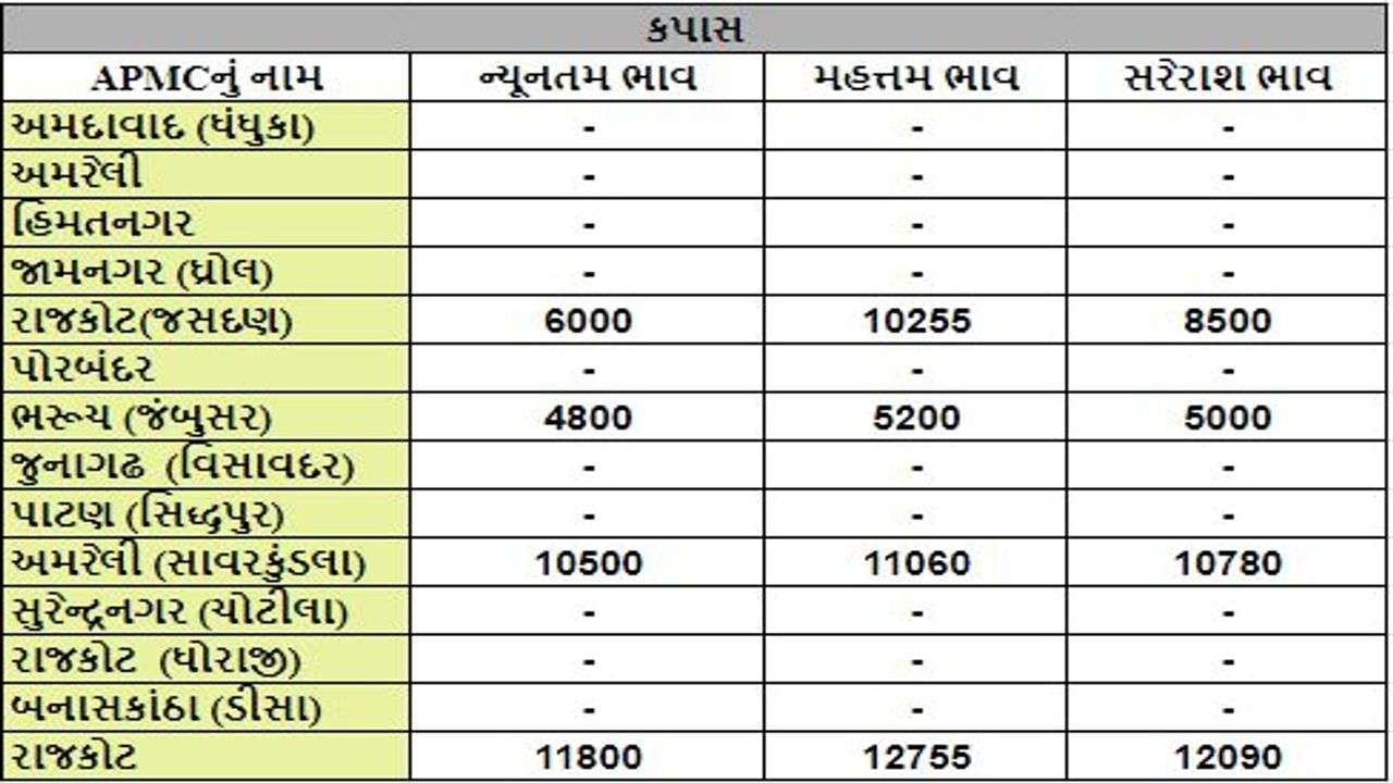 Mandi:રાજકોટ APMCમાં કપાસના મહત્તમ ભાવ રૂપિયા 12755 રહ્યા,ગુજરાતના વિવિધ APMCમાં અનાજના શુ રહ્યા ભાવ (Prices) તે અંગે, ખેડૂત મિત્રો માટે ગુજરાતના પાકોના APMCના ભાવ (Prices) વિશેની માહિતી દરરોજ અમે તમને આપીશું.