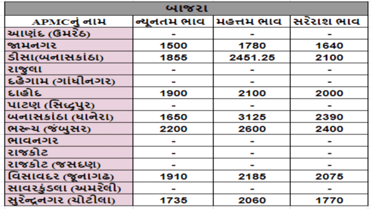 બાજરાના તા.26-09-2023ના રોજ APMCના ભાવ રૂ.1500 થી 3125 રહ્યા.
