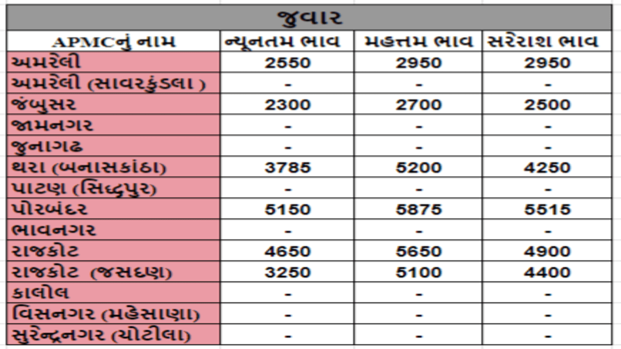 Mandi : પોરબંદરની APMCમાં જુવારના મહત્તમ ભાવ રૂપિયા 5875 રહ્યા, જાણો જુદા-જુદા પાકના ભાવ. ગુજરાતના વિવિધ APMC માં અનાજના શુ રહ્યા ભાવ ( Prices ) તે અંગે, ખેડૂત મિત્રો માટે ગુજરાતના પાકોના APMC ના ભાવ ( Prices ) વિશેની માહિતી દરરોજ અમે તમને આપીશું.