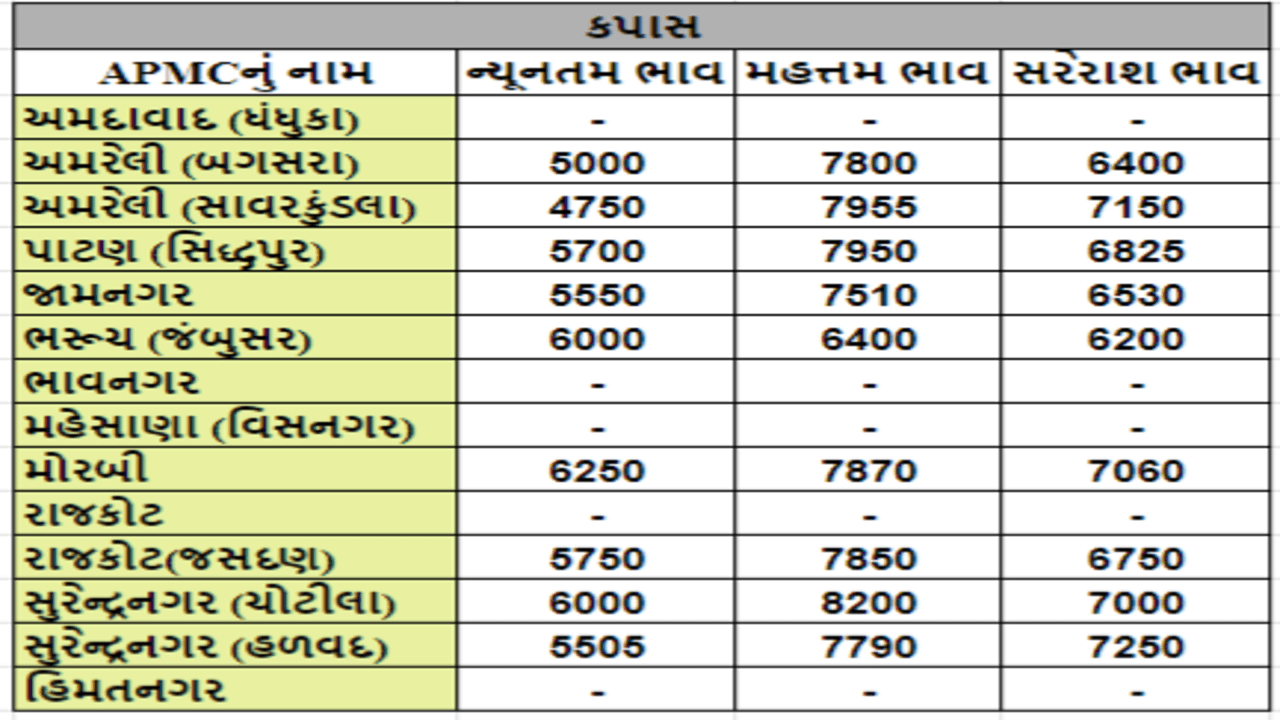 કપાસના તા.26-09-2023ના રોજ APMCના ભાવ રૂ.4750 થી 8200 રહ્યા.