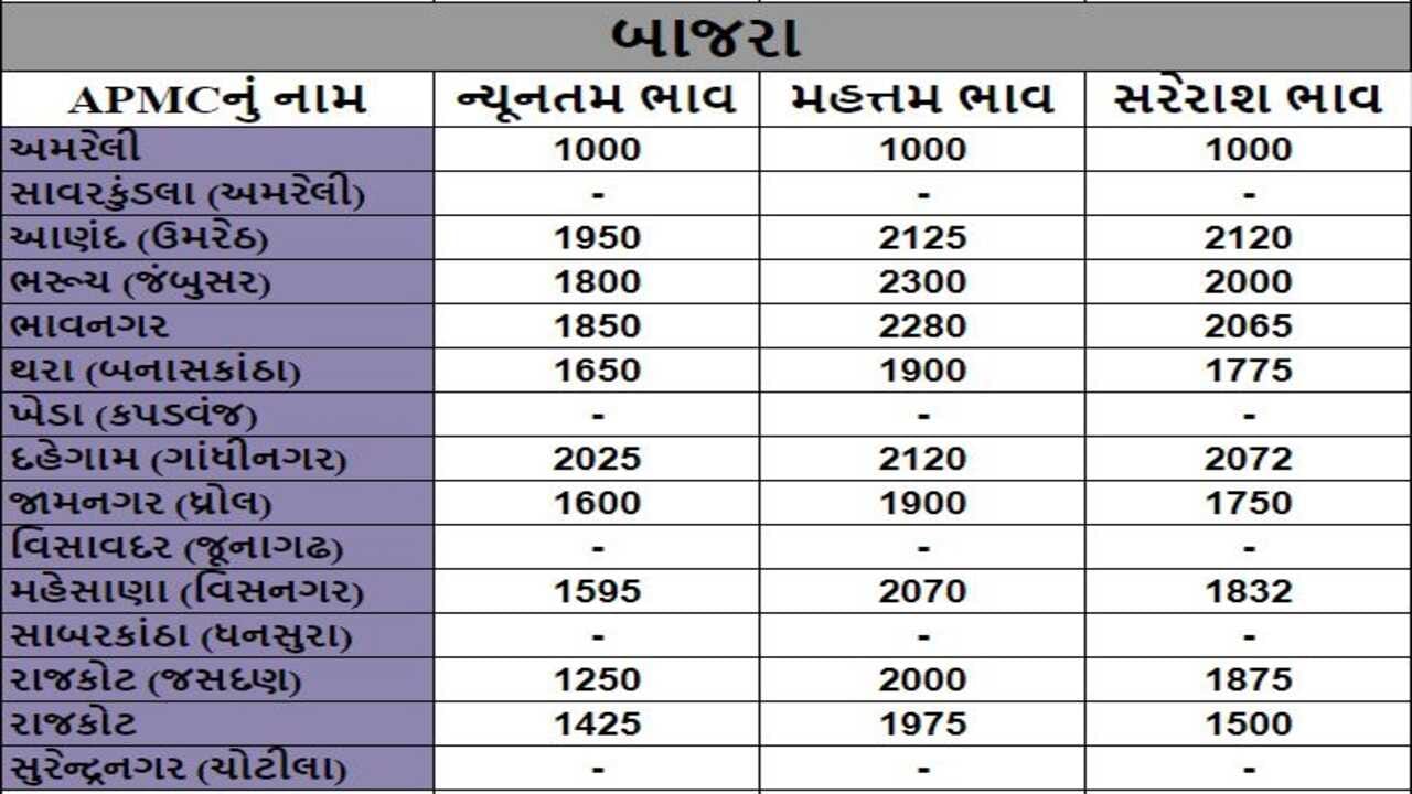 બાજરાના તા.18-10-2022ના રોજ APMCના ભાવ રૂ.1000 થી 2300 રહ્યા.