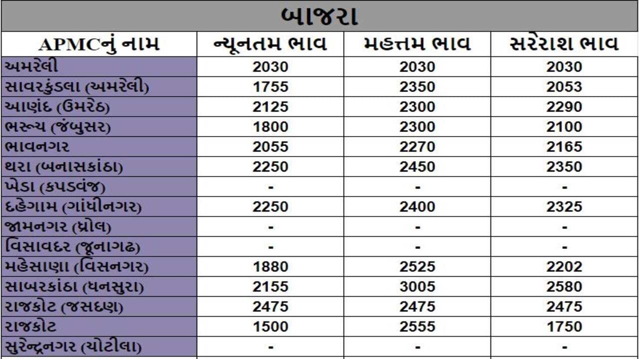બાજરાના તા.09-11-2022ના રોજ APMCના ભાવ રૂ.1500 થી 3005 રહ્યા.