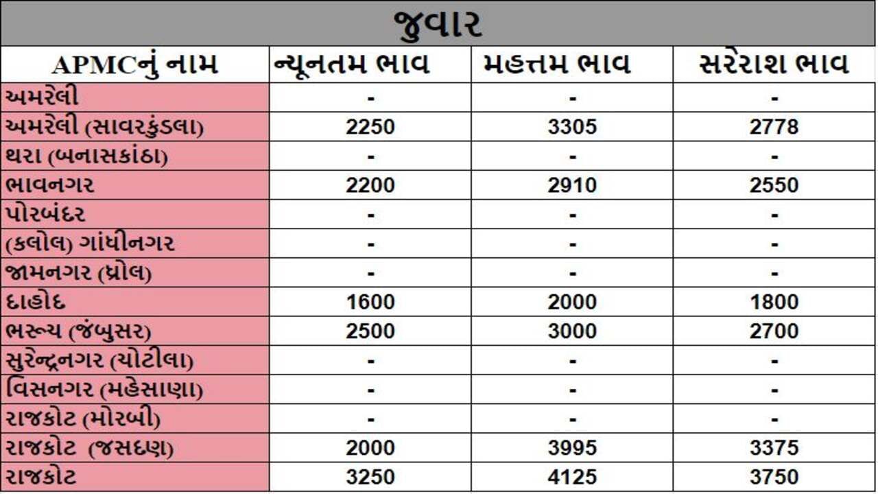 Mandi : રાજકોટ APMCમાં જુવારના મહત્તમ ભાવ રૂપિયા 4125 રહ્યા, જાણો જુદા-જુદા પાકના ભાવ. ગુજરાતના વિવિધ APMC માં અનાજના શુ રહ્યા ભાવ તે અંગે, ખેડૂત મિત્રો માટે ગુજરાતના પાકોના APMC ના ભાવ વિશેની માહિતી દરરોજ અમે તમને આપીશું.