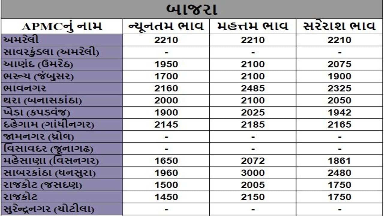બાજરાના તા.08-07-2022ના રોજ APMCના ભાવ રૂ.1450 થી 3000 રહ્યા.