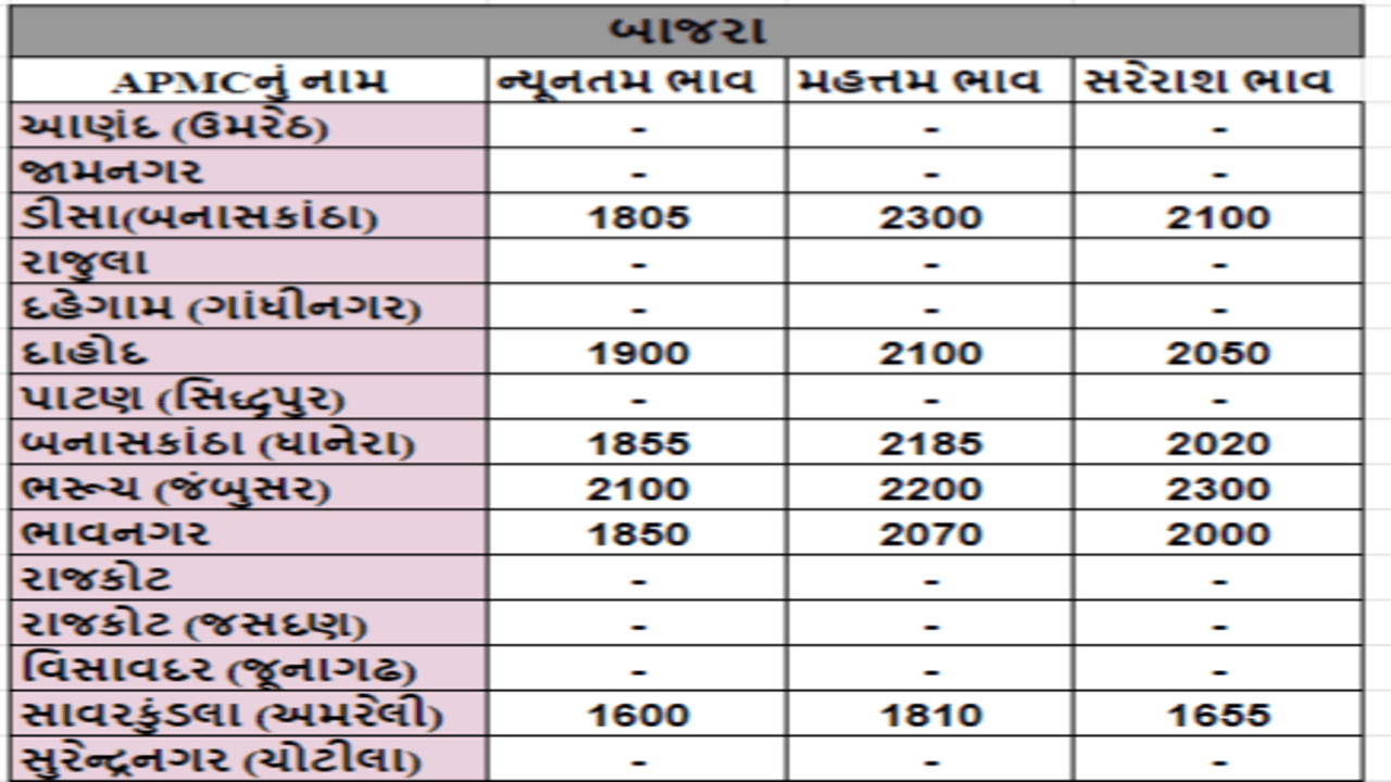 બાજરાના તા.20-09-2023ના રોજ APMCના ભાવ રૂ.1500 થી 2500 રહ્યા.