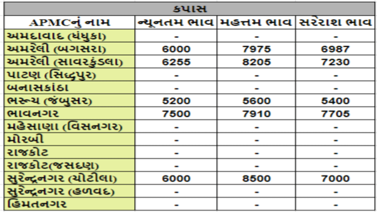 કપાસના તા.20-09-2023ના રોજ APMCના ભાવ રૂ.5200 થી 8500 રહ્યા.