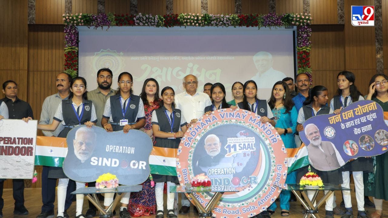 અમદાવાદના ભૂયંગદેવમાં આવેલ સાધના વિનય મંદિર સ્કૂલની વિદ્યાર્થિનીઓ દ્વારા ઑપરેશન સિંદૂરની થીમ પર 100 ફૂટ લાંબી રાખડીનું નિર્માણ કરાયું છે. ત્યારે ધોરણ 9 થી 12ની વિદ્યાર્થિનીઓ આ 100 ફૂટ વિશાળ રાખડી લઈને મુખ્યપ્રધાનને આપવા ગાંધીનગર પહોંચી હતી. 100 ફૂટની આ રાખડી લોકોમાં આકર્ષણનું કેન્દ્ર બની હતી.