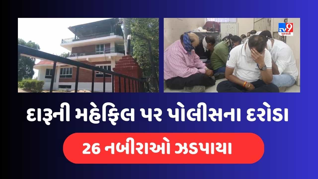 ગુજરાતમાં દારૂબંધીના ધજાગરા ઉડાવનાર સામે પોલીસ લાલ આંખ કરી છે. આ અંગે દારૂની બદીને નાથવા પોલીસ સર્વેલન્સમાં હતી તે દરમ્યાન પોલીસને બાતમી મળી હતી. જેમાં અન્ય જિલ્લાઓમાંથી આવી ફાર્મ હાઉસમાં પાર્ટી કરવાનું 26 લોકોને ભારે પડ્યું છે.
