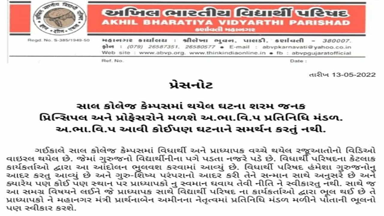 મહત્વનું છે કે, કોલેજમાં અભ્યાસ કરતી વિદ્યાર્થિનીની હાજરી મુદ્દે ABVPના વિદ્યાર્થી નેતાઓ દ્વારા પ્રિન્સિપાલ સમક્ષ ઉગ્ર રજૂઆત કરવામાં આવી હતી. તે દરમિયાન કોલેજના પ્રિન્સિપાલ વિદ્યાર્થીઓ આગળ બે હાથ જોડી પગે લાગતા હોય તેવો વીડિયો વાયરલ થયો હતો. વીડિયો વાયરલ થયા બાદ ABVP દ્વારા ભૂલનો સ્વીકાર કરી લૂલો બચાવ કરવામાં આવ્યો છે.