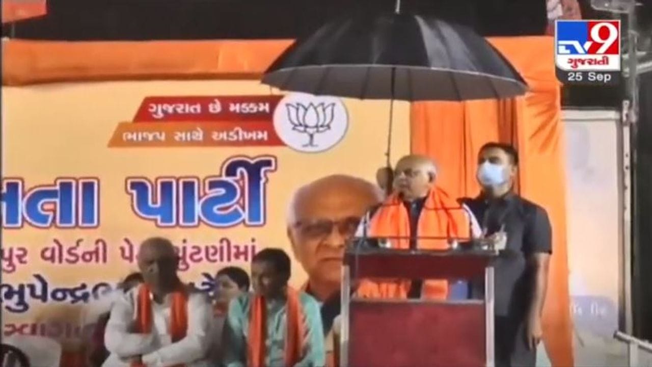 શરૂ વરસાદે મુખ્યપ્રધાન ભુપેન્દ્ર પટેલે જાહેરસભાને સંબોધી, કાર્યકરોએ વરસાદમાં પલળીને પણ તેમને સાંભળ્યા