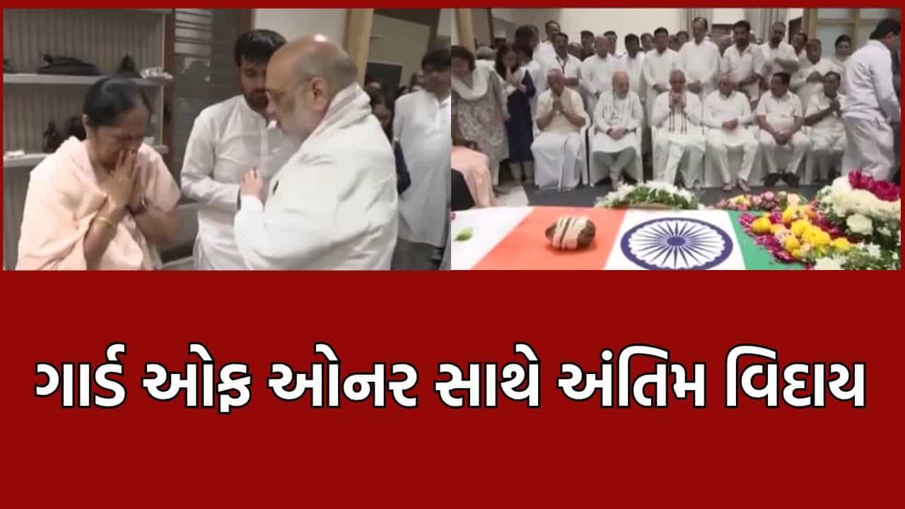 ગુજરાતના પૂર્વ CM વિજય રૂપાણીને રાજકીય સન્માન સાથે અંતિમ વિદાય આપવામાં આવી રહી છે. તેમના અંતિમ દર્શન માટે અનેક દિગ્ગજ રાજકીય નેતાઓ આવી પહોંચ્યા છે. જેમા ગૃહમંત્રી અમિત શાહ, ભાજપના રાષ્ટ્રીય અધ્યક્ષ જેપી નડ્ડા, ગુજરાતના મુખ્યમંત્રી, સી.આર.પાટીલ, રાજ્યપાલ, કુમાર સ્વામી, સંગઠન મહામંત્રી રત્નાકર સહિતના રાજકીય અગ્રણીઓ સામેલ છે. વિજય રૂપાણીના નિવાસસ્થાનની બાજુમાં આવેલા મહાદેવ મંદિરે તેમને ગાર્ડ ઓફ ઓનર આપવામાં આવ્યુ જે બાદ તેમની અંતિમ વિધિ કરવામાં આવી હતી.