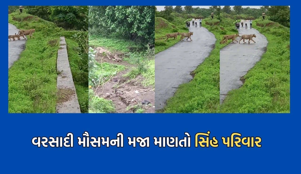 અમરેલી: ખાંભામાં વરસાદી મૌસમની મજા માણવા નીકળ્યો સિંહ પરિવાર – જુઓ Video