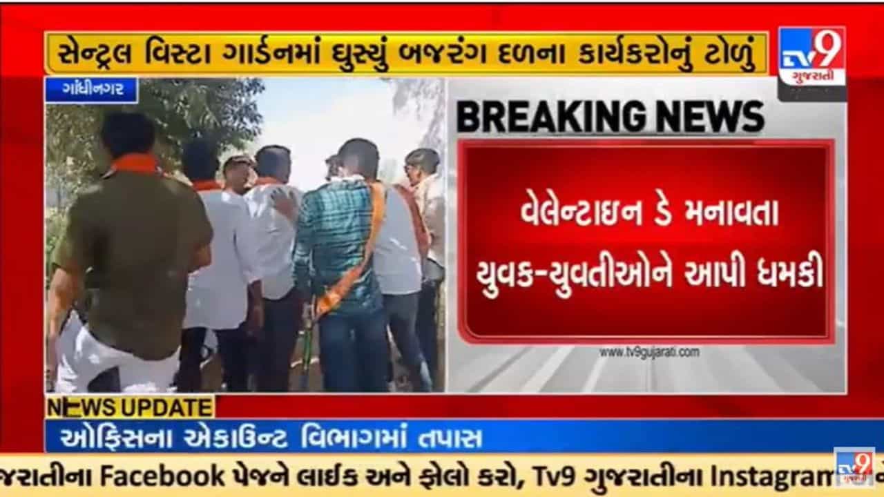 ગુજરાતના ગાંધીનગરમાં વેલેન્ટાઇન ડેની ઉજવણીમાં બજરંગ દળની દાદાગીરી સામે આવી છે . જેમાં સેન્ટ્રલ વિસ્ટા ગાર્ડનમાં બજરંગ દળના કાર્યકરોનું ટોળું ઘુસ્યું હતું. તેમણે વેલેન્ટાઇન ડે મનાવતા યુવક-યુવતીઓને ધમકી આપી હતી. આ કાર્યકરો હાથમાં લાકડીઓ અને ધોકા લઇને પહોંચ્યા હતા.