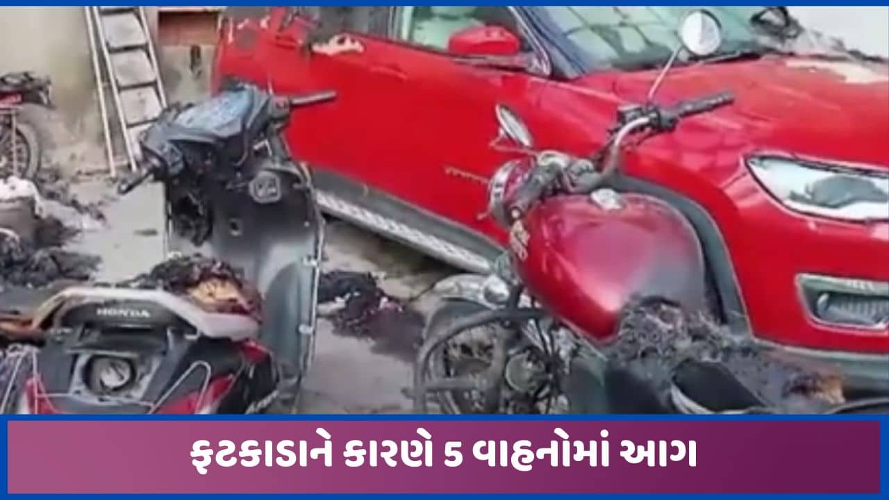 પાલનપુરમાં ફટાકડાને કારણે શેડમાં પાર્ક કરેલ 5 વાહનોમાં આગ લાગી, થયુ મોટું નુક્સાન, જુઓ