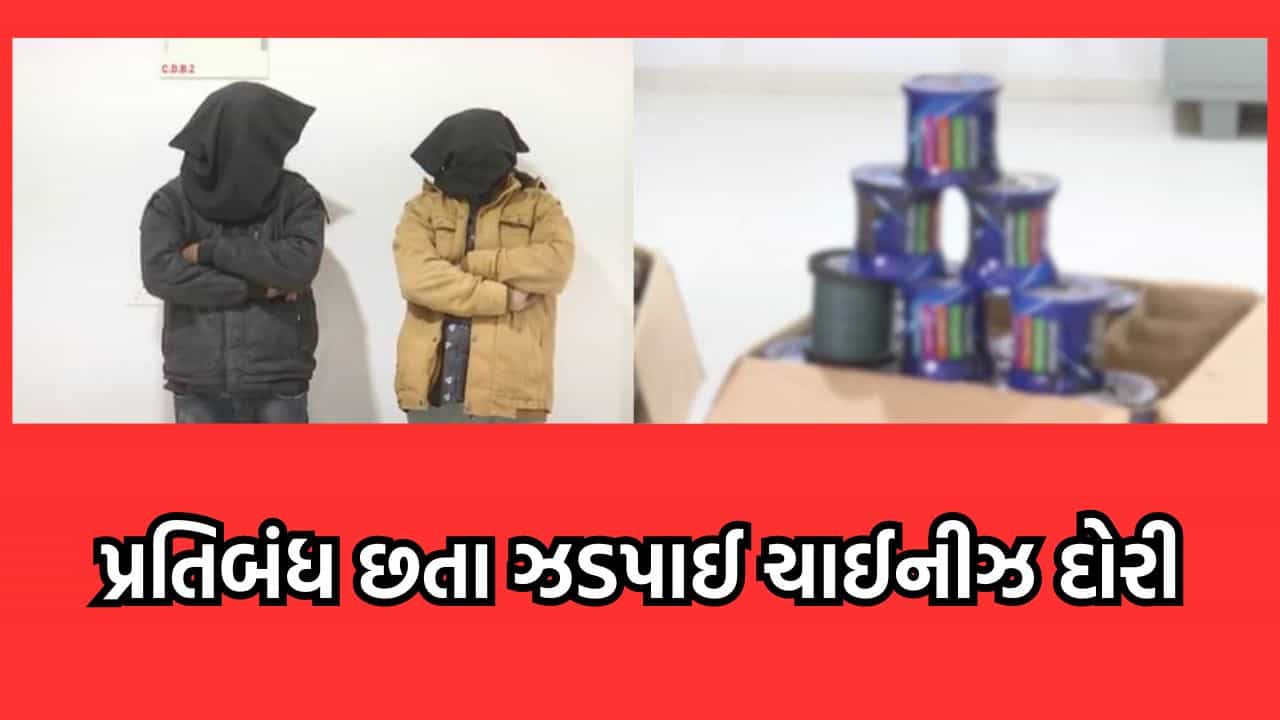 પતંગ ચગાવવા માટે ચાઇનીઝ દોરી પર પ્રતિબંધ હોવા છતાં લોકો બેફામ વેચાણ કરી રહ્યા છે. રાજકોટના ગોંડલ રોડ પર આવેલા રસુલપુરા પાસે ક્રાઇમ બ્રાન્ચે ચાઇનીઝ દોરીનો જથ્થો ઝડપ્યો અને બે શખ્સોની ધરપકડ પણ કરી. કૌશલ મસરાણી અને નિરજ મસરાણી નામના બે શખ્સો રસુલપુરા પાસે ખુલ્લેઆમ એક કારમાં ચાઇનીઝ દોરી વેચી રહ્યા હતા. જેની ક્રાઇમ બ્રાન્ચને ચોક્કસ બાતમી મળતા દરોડા પાડ્યા અને સ્થળ પરથી રૂપિયા 37 હજારની 146 નંગ ચાઇનીઝ દોરી જપ્ત કરી લીધી. ક્રાઇમ બ્રાન્ચે ચાઇનીઝ દોરી અને કાર સહિત 3 લાખ 62 હજારનો મુદ્દામાલ જપ્ત કરી લીધો. તેમજ બંનેની ધરપકડ કરીને વધુ કાર્યવાહી હાથ ધરી.
