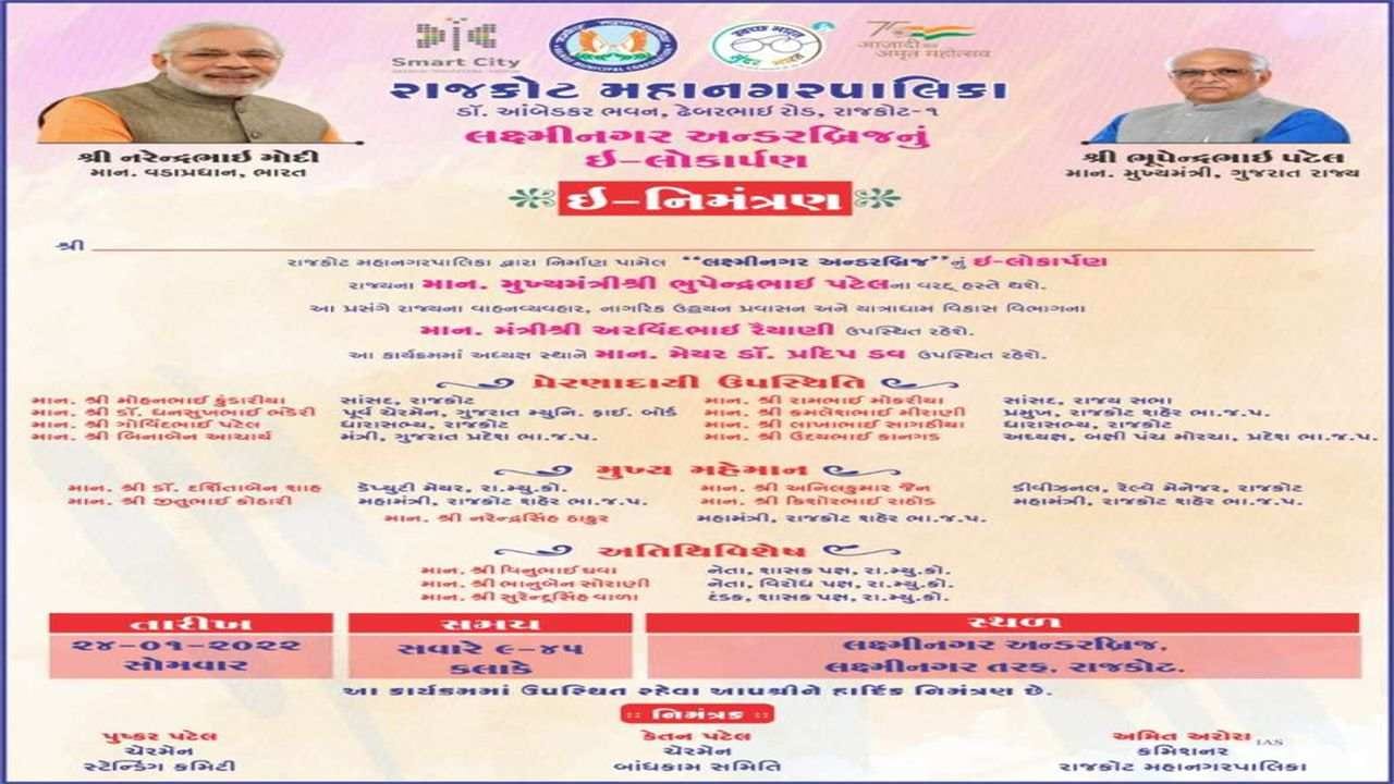કોઈપણ પ્રસંગની આમંત્રણ પત્રિકામાં ઘરના મોભીનું નામ પહેલા લખાતું હોય છે. પરંતુ ઘરના મોભીના નામ વિના આખા ગામમાં આમંત્રણ પહોંચે તો સૌ કોઈને નવાઈ લાગે. આવું જ કંઈક પૂર્વ મુખ્યપ્રધાન વિજય રૂપાણી (Former Chief Minister Vijay Rupani) સાથે થયું છે. રાજકોટ (Rajkot)માં આજે લક્ષ્મીનગર બ્રિજનું મુખ્યમંત્રી ભુપેન્દ્ર પટેલની વર્ચ્યુઅલ ઉપસ્થિતિમાં લોકાર્પણ કરવામાં આવ્યું હતું. પણ કાર્યક્રમની આમંત્રણ પત્રિકા (invitation card)માં વિજય રૂપાણીના નામની બાદબાકી જોવા મળી હતી.