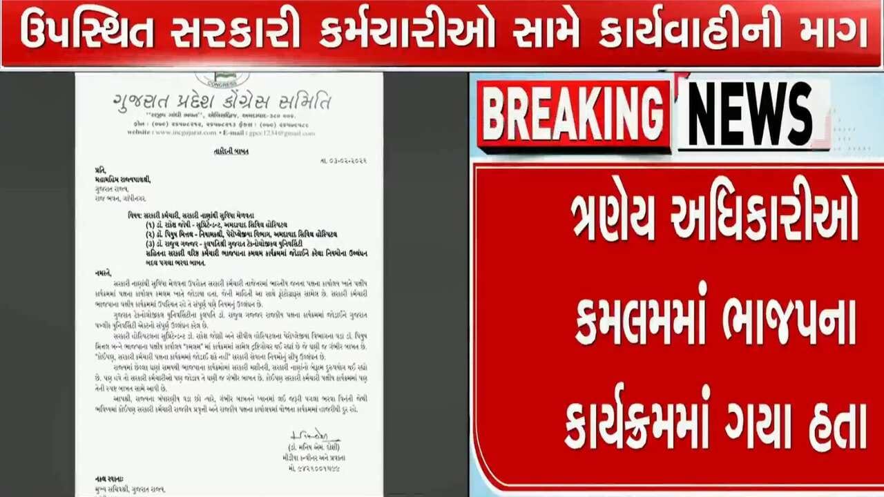 GTUના કુલપતિ રાહુલ ગજ્જર, અમદાવાદ સિવિલ સુપ્રિટેન્ડન્ટ રાકેશ જોષી અને સિવિલના પેરોપ્લેજિયા વિભાગના નિયામક પિયુષ મિત્તલનો એક ફોટો શેર કરીને કોંગ્રેસના પ્રવકત્તા મનિષ દોશીએએ, કમલમમાં ઉપસ્થિત રહેનારા ત્રણેય સરકારી કર્મચારીઓ સામે દાખલારૂપ કાર્યવાહી કરવા રાજ્યપાલ સમક્ષ માંગ કરી છે. જેથી કરીને ભવિષ્યમાં અન્ય કોઈ સરકારી કર્મચારી કોઈ પણ રાજકીય પક્ષના કાર્યક્રમમાં જોડાતા પૂર્વે વિચારે.