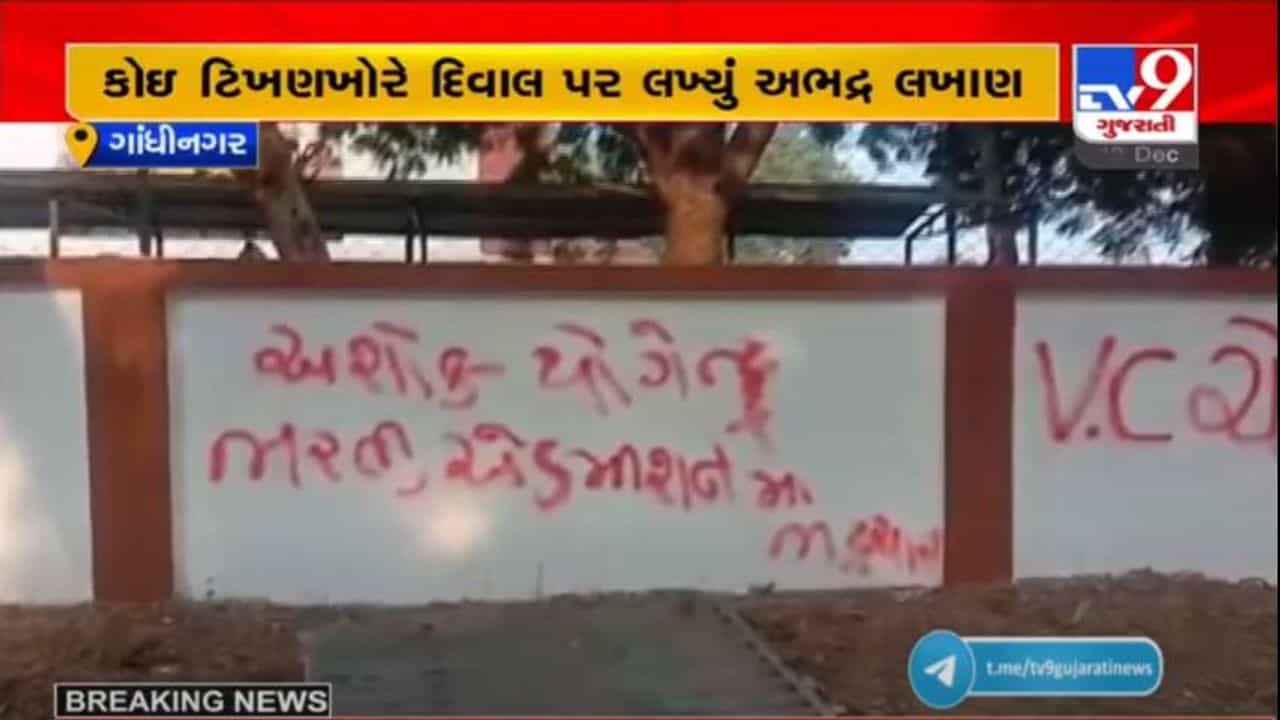 ચિલ્ડ્રન યુનિવર્સિટીની રોડની બાજુએ આવેલી દીવાલ પર કુલપતિ અને યુનિવર્સિટીના સ્ટાફ વિરુદ્ધ અભદ્ર લખાણ લખવામાં આવ્યું છે.