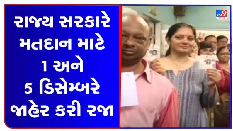 ગુજરાત સરકારે મતદાન માટે 1 અને 5 ડિસેમ્બરે જાહેર રજા કરી છે. જેમાં 1 ડિસેમ્બરે પ્રથમ તબક્કાના મતદાન માટે 19 જિલ્લામાં રજા જાહેર; 5 ડિસેમ્બરે બીજા તબક્કાના મતદાન માટે 14 જિલ્લામાં રજા જાહેર કરી છે. જેમાં વધુ મતદાન થાય તે માટે સરકારે નિર્ણય લીધો છે.
