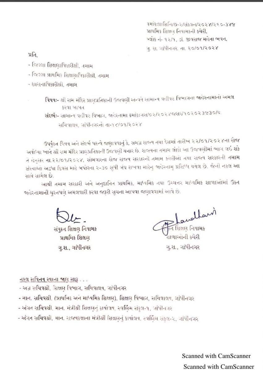 રાજ્ય સરકારે પણ ગુજરાતમાં અડધા દિવસની રજા જાહેર કરી છે. સરકારી અને અર્ધ સરકારી કચેરીઓ બપોરના 2:30 વાગ્યા સુધી બંધ રહેશે.22મીના મહોત્સવમાં તમામને જોડવા સરકારે આ નિર્ણય લીધો છે. ઉલ્લેખનીય છે કે પ્રાણ પ્રતિષ્ઠા મહોત્સવના દિવસે રાજ્યભરમાં જાહેર રજાની માગ સરકારના વિવિધ વિભાગોમાંથી ઉઠી હતી.કેન્દ્ર સરકારે 22 જાન્યુઆરીએ સરકારી કર્મચારીઓને અડધા દિવસની રજા આપવાની જાહેરાત કરી છે.