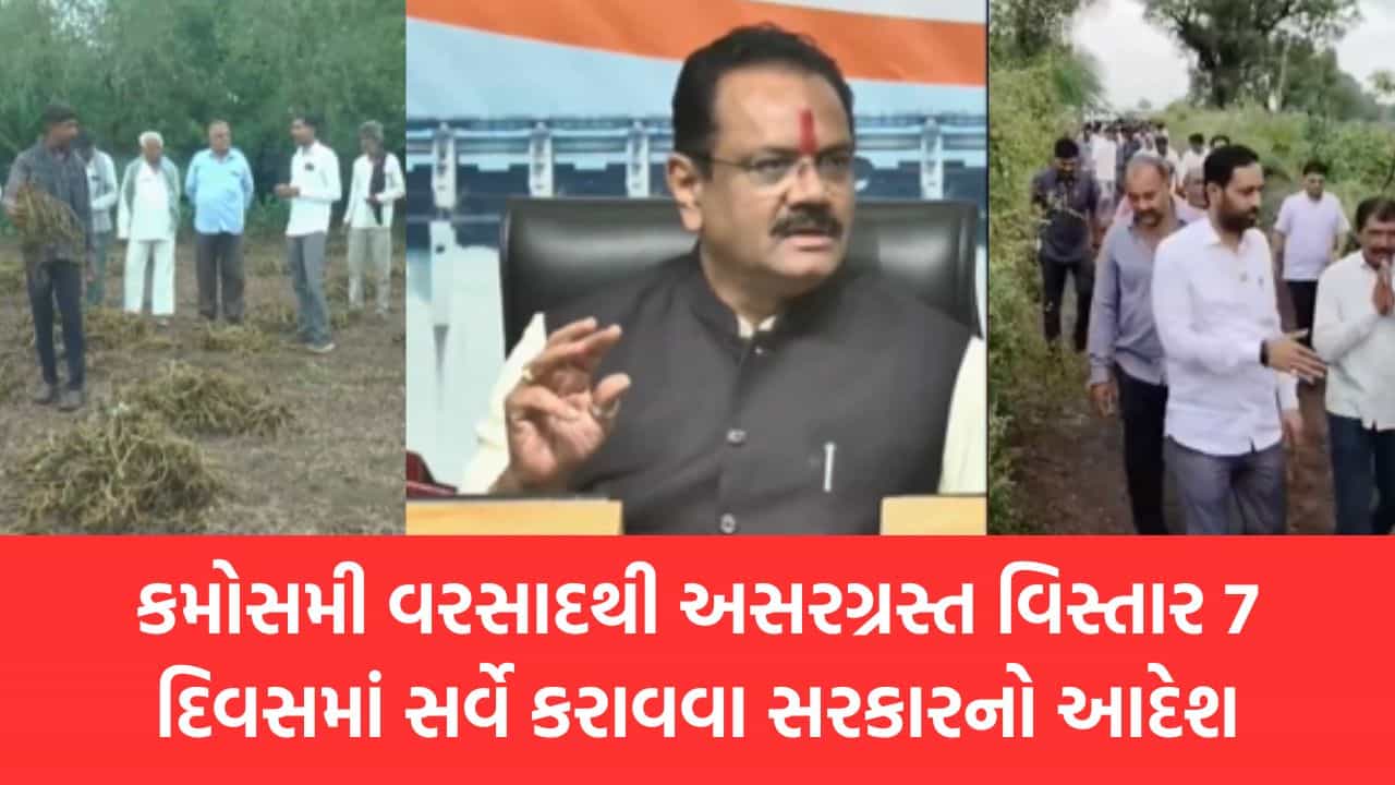 ગુજરાતમાં છેલ્લા બે-ત્રણ દિવસથી વરસી રહેલા કમોસમી વરસાદને પગલે, જગતના તાતના મ્હો સુધી આવેલ પાક ઉત્પાદનરુપી કોળિયો છીનવાઈ ગયો છે. ગુજરાતના ખેડૂતને થયેલા આર્થિક નુકસાનમાં મદદ કરવા માટે સરકારે આદેશ આપ્યા છે. મુખ્ય પ્રધાન ભૂપેન્દ્ર પટેલના અધ્યક્ષસ્થાને મળેલ કેબિનેટની બેઠકમાં અધિકારીઓને જરૂરી આદેશ આપવામાં આવ્યા છે. આગામી સાત દિવસમાં રાજ્યના 33 જિલ્લામાં 239 તાલુકામાં નુકસાન અંગેનો સર્વે હાથ ધરવા કહેવામાં આવ્યું છે.