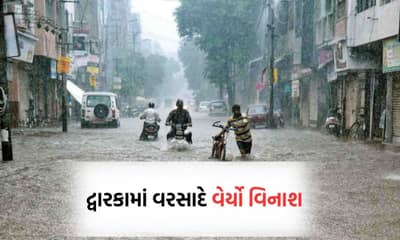 સૌરાષ્ટ્રમાં ભારે વરસાદથી ભયાનક પૂરની સ્થિતિ સર્જાઈ છે. દ્વારકાથી જૂનાગઢ સુધી મકાનો તણાયાં છે અને લોકો જીવ બચાવવા સંઘર્ષ કરી રહ્યા છે. કેશોદમાં નદીનો પાળો તૂટવાથી મકાન ધરાશાયી થયું, જ્યારે ભાણવડમાં પર્યટકો પાણીમાં ફસાયા હતા. કલ્યાણપુરામાં ડેમ ઓવરફ્લો થતાં નદી દરિયામાં ભળી ગઈ. આ વિનાશકારી ઘટનાઓનો વીડિયો વાયરલ થયો છે.