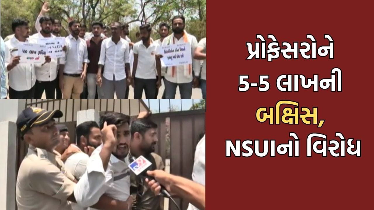ગુજરાત યુનિવર્સિટીમાં NAAC ટીમની મુલાકાત દરમિયાન પ્રોફેસરોને આપવામાં આવેલી પ્રોત્સાહન રકમને લઈને NSUIએ ઉગ્ર વિરોધ કર્યો છે. NSUIનો આરોપ છે કે આ નાણાં વિદ્યાર્થીઓની ફીમાંથી આપવામાં આવ્યા છે. તેમણે કુલપતિના નિવાસસ્થાનનો ઘેરાવો કરીને રકમ પરત કરવાની માંગ કરી છે.