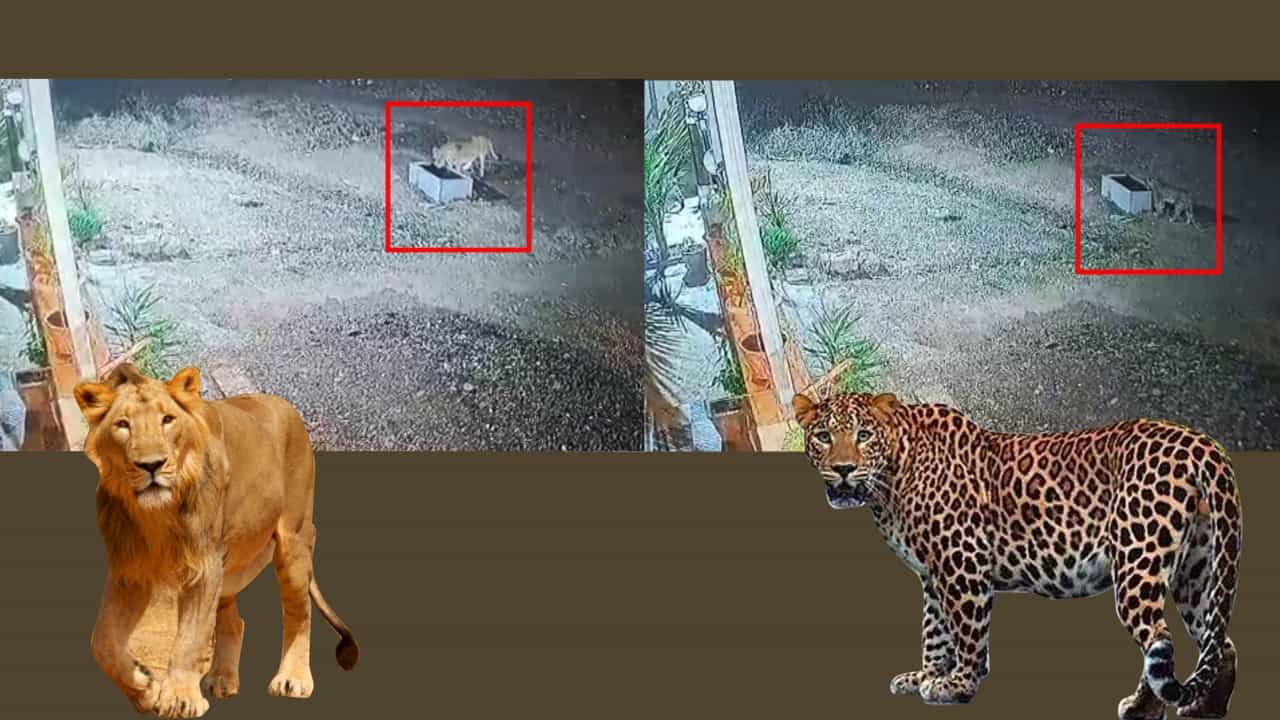 અમરેલીમાં સિંહ. દીપડા, જરખ સહિતના વન્ય પ્રાણીઓ વસે છે જોકે તેઓ એક સાથે ભાગ્યે જ જોવા મળે છે. પરંતુ અહીં એક ઘરની બહાર રાખવામાં આવેલી પાણીની કુંડીમાંથી પાણી પીતા સિંહણ અને દીપડો સીસીટીવીમાં કેદ થયા હતા. સીસીટીવીમાં જોવા મળી રહ્યું છે કે ઘરની દીવાલની બહાર એક પાણીની કુંડી છે તેમાં સૌ પહેલા દીપડો પાણી પીવા આવે છે અને ત્યાર બાદ થોડો સમય પસાર થાય છે એટલે સિંહ પણ ત્યાં જ પાણી પીવા આવે છે. તો થોડો સમય પસાર થયા બાદ સીસીટીવીમાં જોવા મળી રહ્યું છે કે દીપડો કોઈ પ્રાણીનો શિકાર કરવા માટે દોટ લગાવે છે.