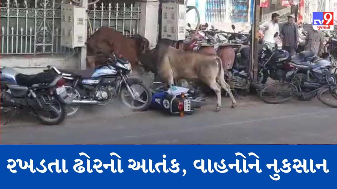 Gujarati video: જામનગરમાં આખલાઓએ ધીંગાણું કરતા વાહનોને પહોંચાડયું નુકસાન, જુઓ વાયરલ Video