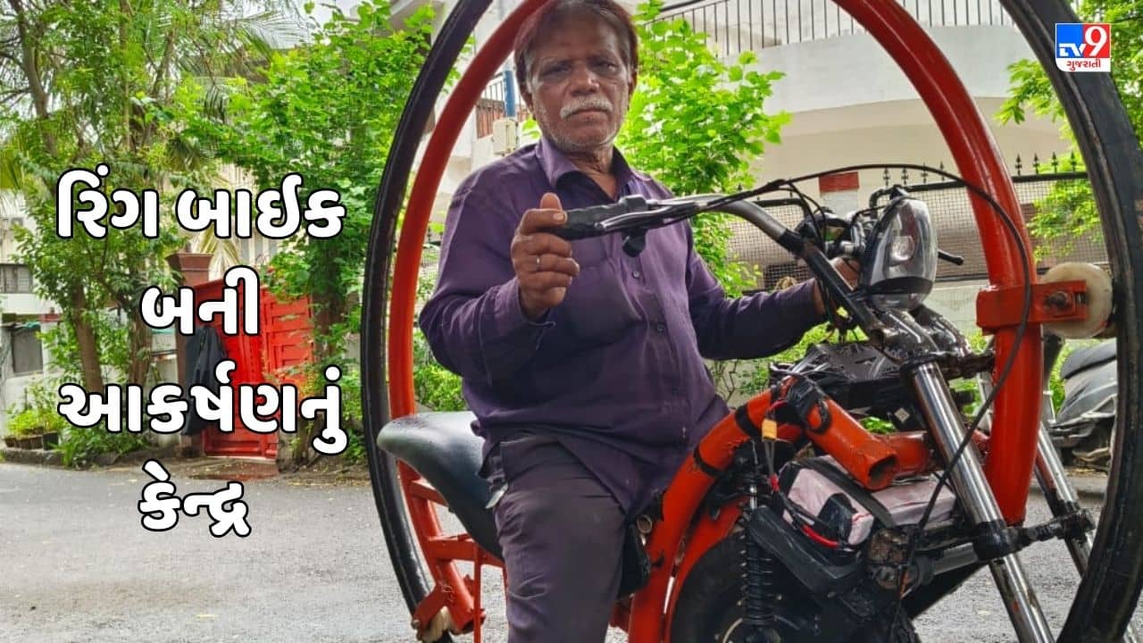 Ring bike : સુરતના રસ્તા પર પૃથ્વીના ગોળા જેવી બાઈક નીકળતા લોકો જોતા રહી ગયા છે. સુરતના સાત ધોરણ ભણેલા નટુકાકાએ હોલિવૂડ ફિલ્મોની બાઇકોને ટક્કર મારે એવી ઇલેક્ટ્રિક રિંગ બાઇક બનાવી છે. આ રિંગબાઈક લઇને નટુકાકા રસ્તા પર નીકળે ત્યારે લોકોની તેના પરથી નજર જ હટતી નથી. આ રિંગ બાઈક શ્રીકૃષ્ણ ગેરેજના માલિક નટુ પટેલે બનાવી છે.