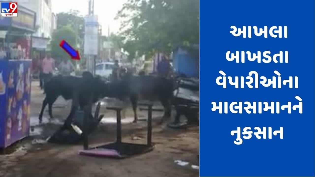 Gujarati Video: બજાર વચ્ચે બે આખલા બાખડતા, દુકાનદારોના સામાનને નુકસાન, જુઓ Video