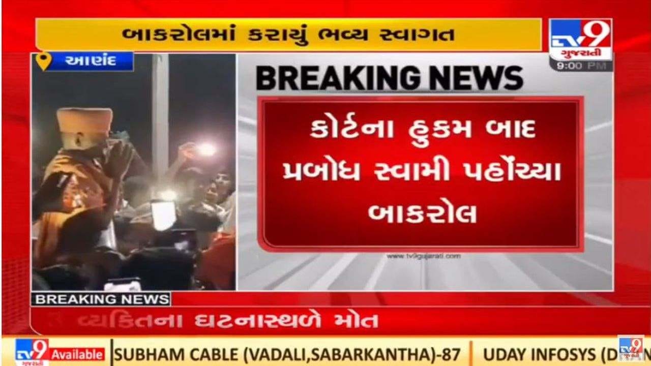 ગુજરાતના વડોદરાના(Vadodara) સોખડા હરિધામ(Sokhda Haridham) વિવાદ કેસમાં હાઇકોર્ટે વચગાળાનો આદેશ આપ્યો છે. જેમાં હાઇકોર્ટના વચગાળાના આદેશને પ્રબોધ સ્વામીના(Prabodh Swami) હરિભક્તોએ આવકાર્યો છે. તેમજ પ્રબોધ સ્વામી જ્યાં પણ રહે તેનાથી હરિભક્તો ખુશ છે. જો કે જો કે પ્રબોધ સ્વામી હાલ આણંદના(a બાકરોલ આશ્રમ ખાતે જવા રવાના થયા હતા. તેમજ બાકરોલ  આત્મીય વિદ્યાધામ  ખાતે હરિભકતોએ તેમનું ભવ્ય સ્વાગત કર્યું હતું. હરિભકતોને  સત્યના પક્ષમાં ભવિષ્યમાં ચુકાદો આવે આશા છે.