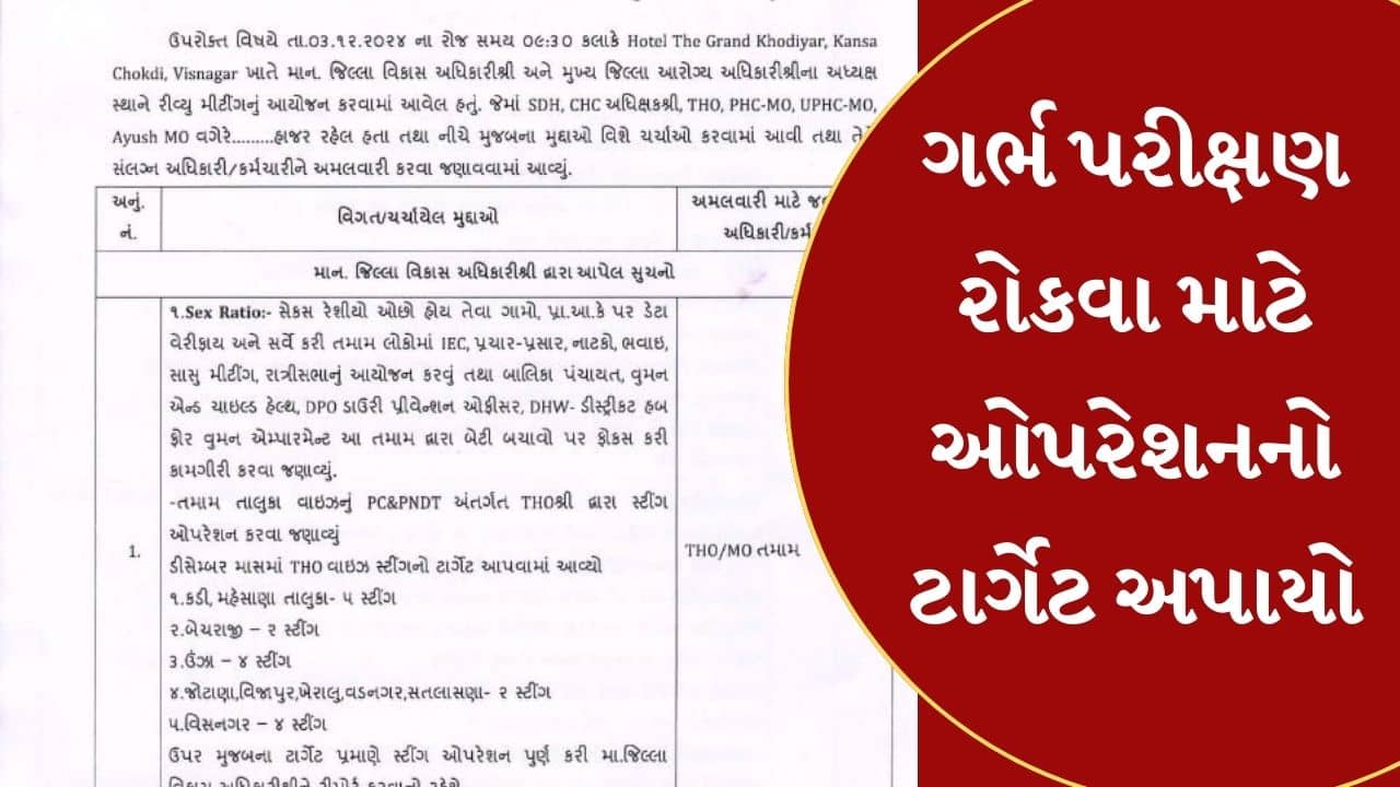 ગુજરાતમાં મહેસાણા જિલ્લામાં દીકરાની સરખામણીમાં દીકરીનો રેશિયો ઘણો ઓછો છે. તેના કારણે ગુજરાત સરકાર અને મહેસાણા જિલ્લા વહીવટી તંત્ર દ્વારા અનેક પ્રકારના પ્રયાસ કરાયા હતો. પરંતુ જેન્ડર રેશિયો જાળવવા ટાર્ગેટથી કામગીરી કરતા હોવાનું સામે આવ્યું છે.જેન્ડર રેશિયો જાળવવા ગેરકાયદેસર ગર્ભ પરીક્ષણ કરતા તમામ તબીબો સામે કાર્યવાહી માટે સ્ટિંગ ઓપરેશન કરવા 10 તાલુકા હેલ્થ ઓફિસરોને પરિપત્ર મોકલાયો છે. આ પરિપત્ર જિલ્લા વિકાસ અધિકારીની જાણ બહાર કર્યો હોવાનું સામે આવ્યું છે.