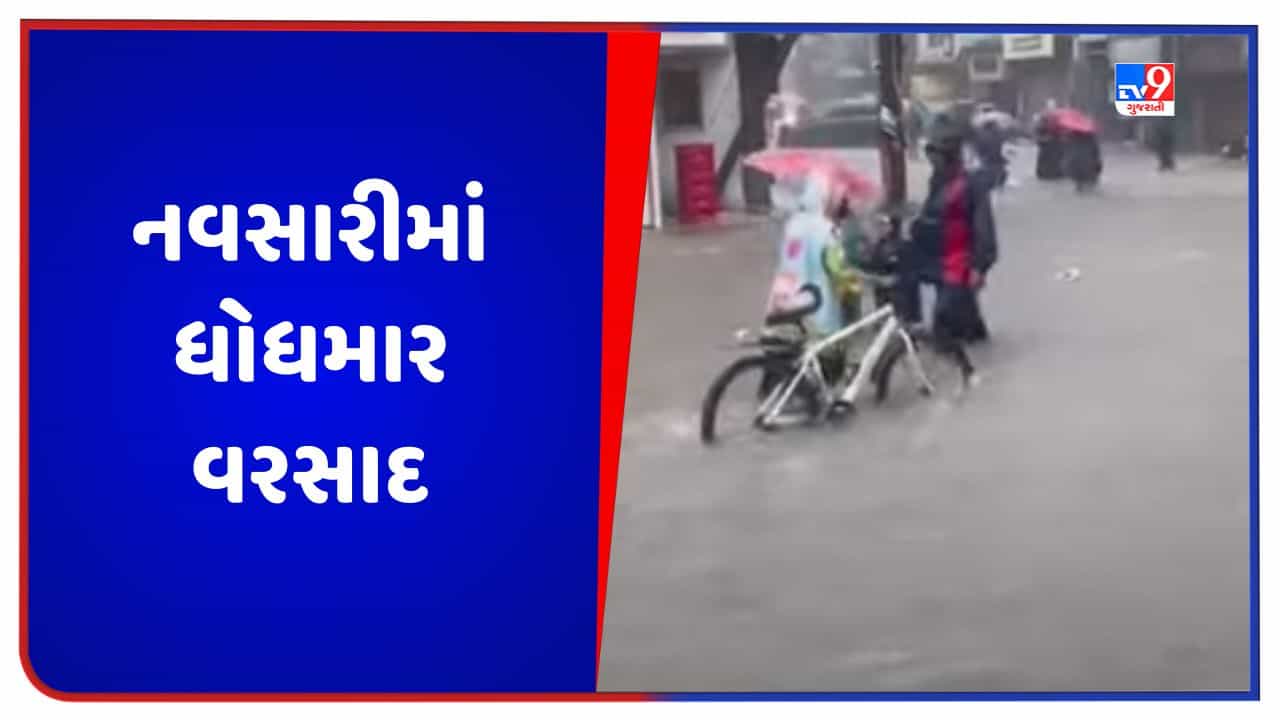 નવસારીમાં ધોધમાર વરસાદથી (Heavy Rain) જનજીવન અસ્તવ્યસ્ત થયું છે. શહેરના મુખ્ય રસ્તા વરસાદી પાણીમાં ગરકાવ થવાથી ટ્રાફિક જામના દ્રશ્યો સર્જાયા હતા. વરસતા વરસાદમાં ટ્રાફિક થતા વાહન ચાલકો પરેશાન થયા અને નવસારીમાં પાલિકાનો પ્રિમોન્સૂન પ્લાન પાણીમાં ધોવાયો. શહેરના રસ્તા બેટમાં ફેરવાતા ઠેર ઠેર ટ્રાફિક જામ થયો છે. જમાલપોર, ઇટાળવા, લુનસીકુઈના રસ્તા પર 3 ફૂટ પાણી ભરાયા હતા. કાલિયાવાડી અને જુના થાના રસ્તા પર જળબંબાકારની સ્થિતિ જોવા મળી. શહેરનો સુરત (Surat) નવસારી માર્ગ બંધ કરવામાં આવતા લોકો પરેશાન થયા.