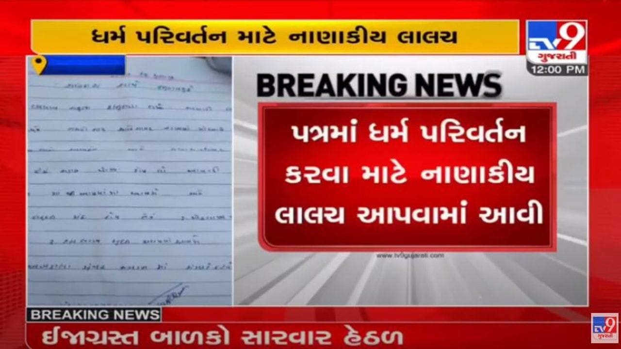 કચ્છના અબડાસાના (Abdasa Taluka)મુઠીયાર ગામના હિન્દુ પરિવારને(Hindu Family) ધર્મ પરિવર્તન માટે નનામો પત્ર મળ્યો છે. અજાણ્યા વ્યક્તિ દ્વારા હિન્દુ પરિવારને નામ જોગ પોસ્ટ મારફતે ધર્મ પરિવર્તન કરવા માટે પત્ર મોકલાયો છે. જેને લઇ હિન્દુ પરિવારે પોલીસને અરજી કરી છે. અરજીમાં ઉલ્લેખ કરાયો છે કે ધર્મપરિવર્તન (Religion Conversion) કરવા માટે નાણાંકીય લાલચ આપવામાં આવી છે. ધર્મ પરિવર્તન માટે એક લાખથી 10 લાખની સહાય આપવા લાલચ આપવામાં આવી છે. 29 એપ્રિલ મળેલા નનામો પત્ર મળ્યા બાદ હાલ પોલીસને જાણ કરવામાં આવી છે. પોલીસે (Kutch Police) અરજીને આધારે ટીખળ માટે કે અન્ય કારણોસર પત્ર લખાયો તે દિશામાં તપાસ શરૂ કરી છે.