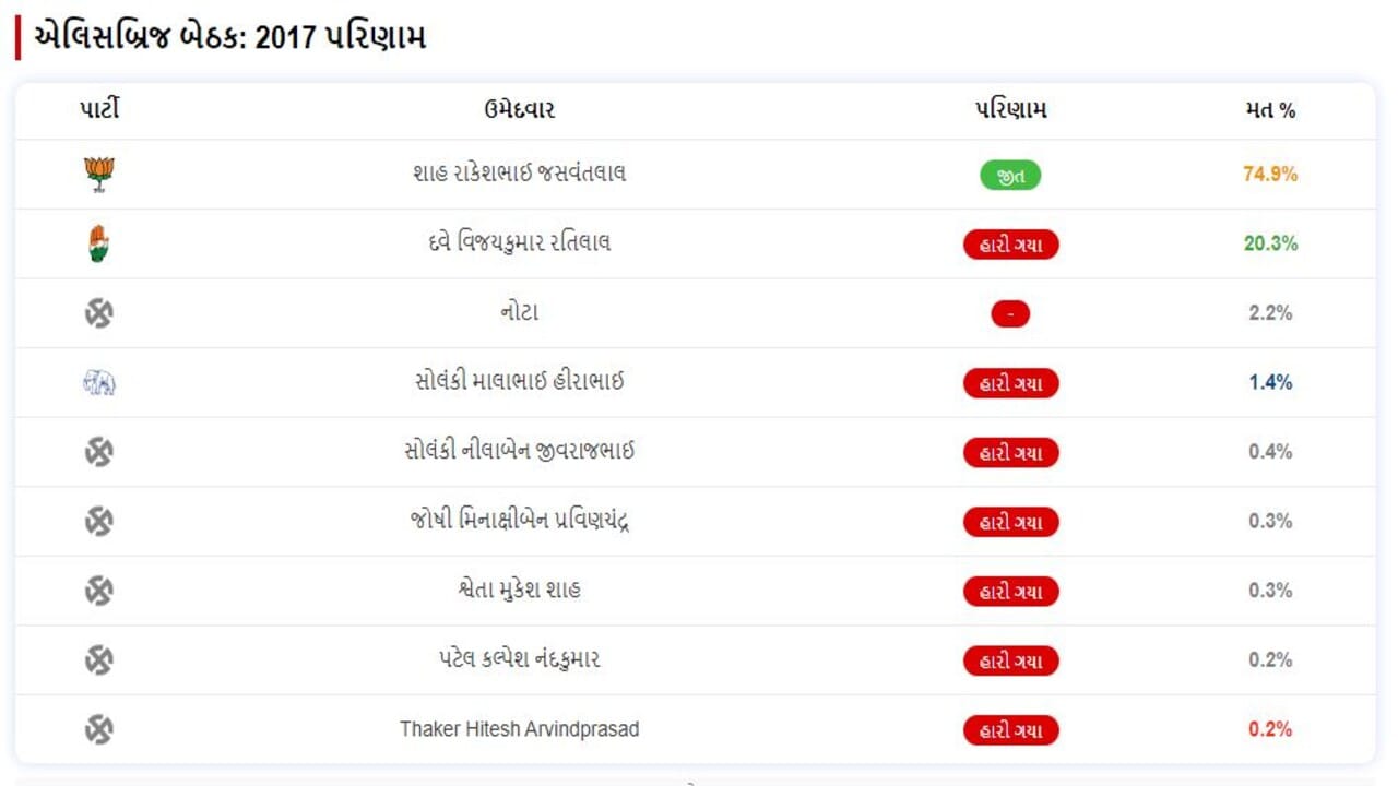મહત્વનું છે કે આ બેઠક ઉપરથી 2017માં શાહ રાકેશભાઈ જસવંતલાલને ધારાસભ્ય તરીકે ચૂંટવામાં આવ્યા હતા. તે બીજેપીના ધારાસભ્ય છે. રાકેશભાઈ જસવંતલાલ શાહ ગુજરાત ના મોટા રાજકીય ચહેરાઓમાંથી એક છે. ગુજરાત વિધાનસભાની ચૂંટણી માટે દરેક પક્ષ અને દરેક ઉમેદવારે કમર કસી છે. ત્યારે ગુજરાતની એલિસબ્રિજ સીટ પર વર્ષ 2017ની વિધાનસભા ચૂંટણી માં શાહ રાકેશભાઈ જસવંતલાલ એ જીત મેળવી હતી.