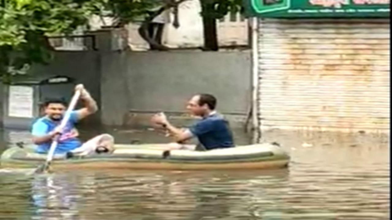 અમદાવાદમાં મણિનગરમાં હાટકેશ્વર સર્કલ પાસે વિકટ પરિસ્થિતિ જોવા મળી રહી છે. ભારે વરસાદ બાદ અમદાવાદનો મણિનગર વિસ્તાર બેટમાં ફેરવાઇ ગયો છે. પાણી ભરાવાને કારણે લોકોને હોડીમાં અવર જવર કરવાની ફરજ પડી છે. લોકો બાઇક અને કાર ચલાવવાના સ્થાને લોકો રસ્તા પર હોડી ચલાવવા મજબૂર બન્યા છે.