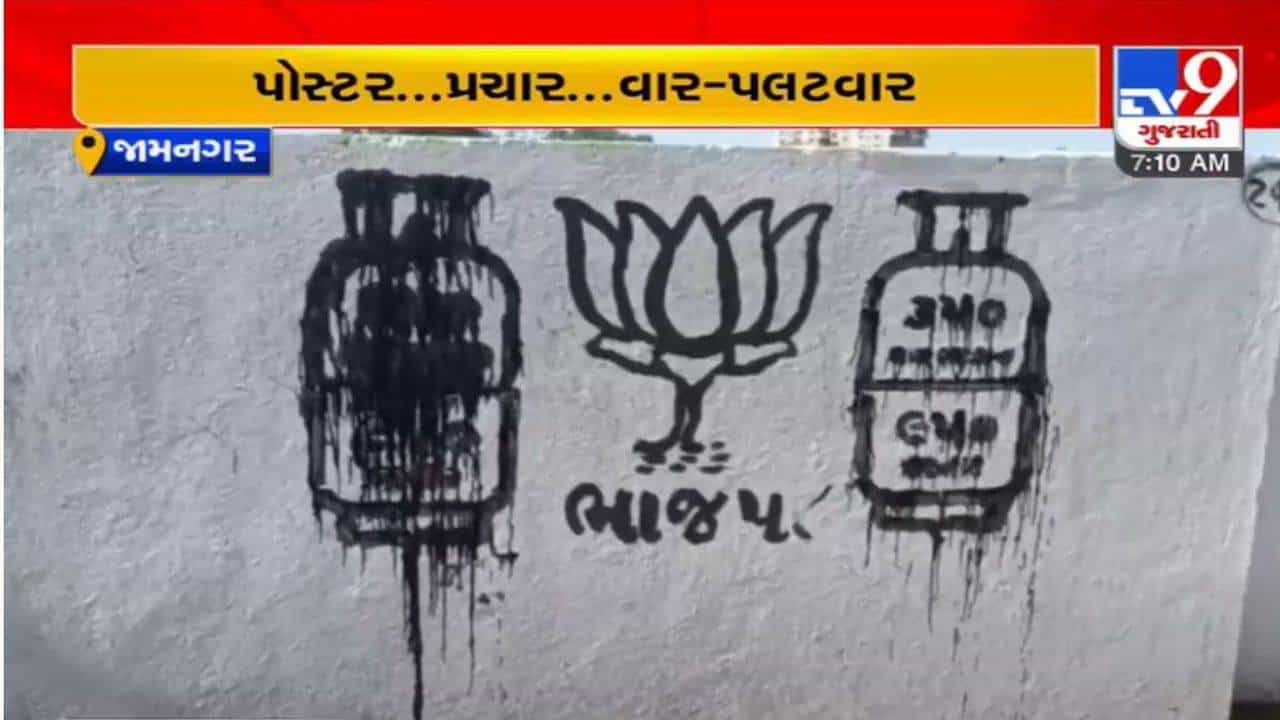 જામનગરમાં (Jamnagar) વિધાનસભાની ચૂંટણી (Assembly elections) પહેલા ભાજપ (BJP)અને કોંગ્રેસ (Congress) વચ્ચે પોસ્ટર યુદ્ધ શરૂ થઈ ગયું છે. જામનગર શહેરની જાહેર દિવાલો પર ભાજપે કમળની પ્રતિકૃતિ બનાવી પ્રચાર શરુ કર્યો છે. શહેરના સાત રસ્તા સર્કલથી પ્રદર્શન મેદાન તરફ આવેલી દિવાલો પર ભાજપે કમળનું ચિહ્ન દોર્યું. તો કમળના ચિહ્ન પાસે જ કોંગ્રેસ દ્વારા ગેસ સિલિન્ડર દોરી, તેમાં પહેલા અને અગાઉના ભાવ દર્શાવી ભાજપ પર મોંઘવારી મુદ્દે નિશાન તાકવામાં આવ્યું છે.