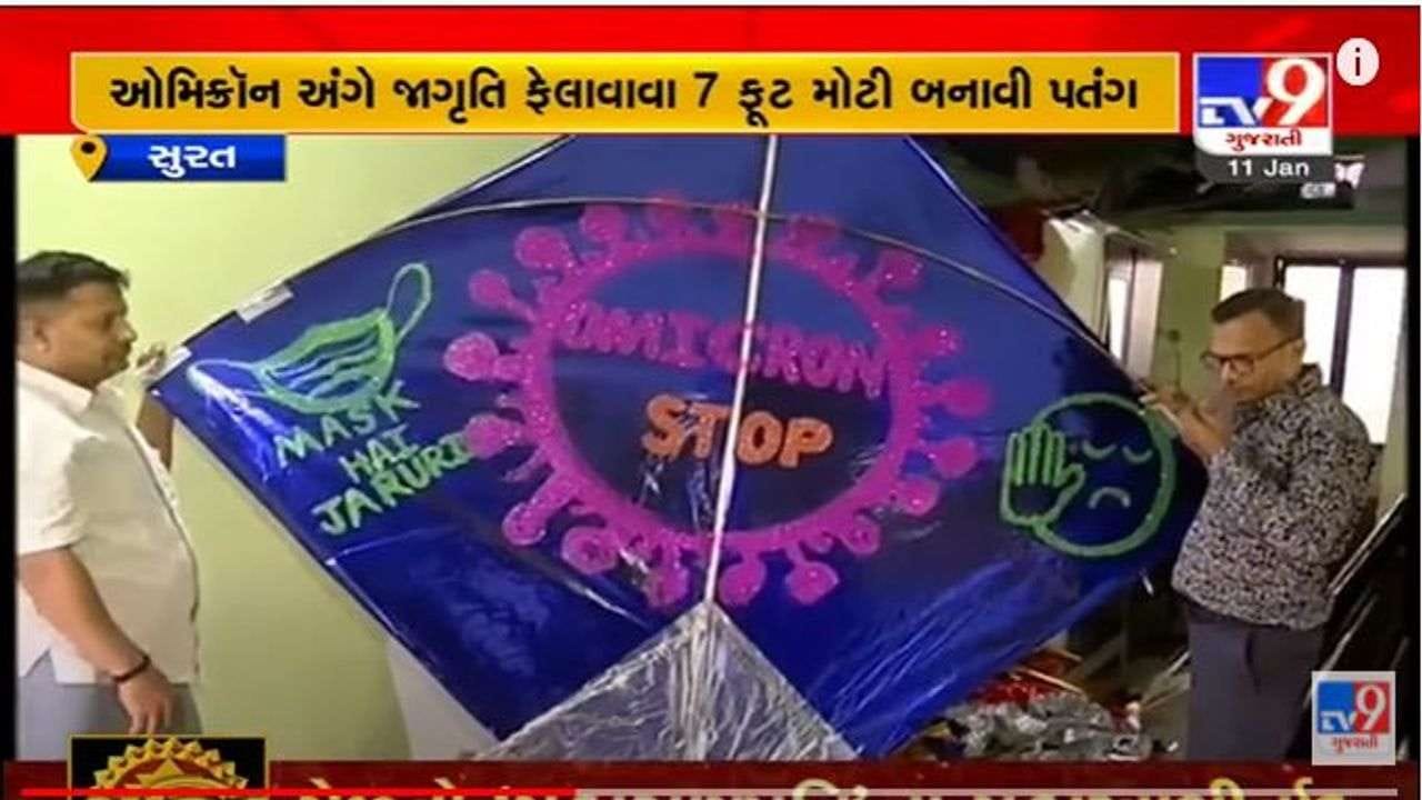 સુરતમાં ઉત્તરાયણનું આગવું જ મહત્વ છે. સુરતમાં દર વર્ષે પતંગ રસિકો અવનવી પતંગ ચગાવી જાગૃતિ પણ ફેલાવતા હોય છે. તેવા જ એક પતંગ રસિક અજય રાણાએ આ વર્ષે અનોખી પતંગો બનાવી છે. અજય રાણાએ કોરોનાના નિયમોની જાગૃતિ ફેલાવતા સૂત્રોવાળી પતંગો બનાવી છે. સાથે જ અજય રાણાએ 25 ફૂટ લાંબી પતંગ પણ બનાવી છે. આ વર્ષે ઓમિક્રોન વેરિએન્ટને ધ્યાનમાં રાખી અજય રાણાએ 7 ફૂટની પતંગ બનાવી છે.