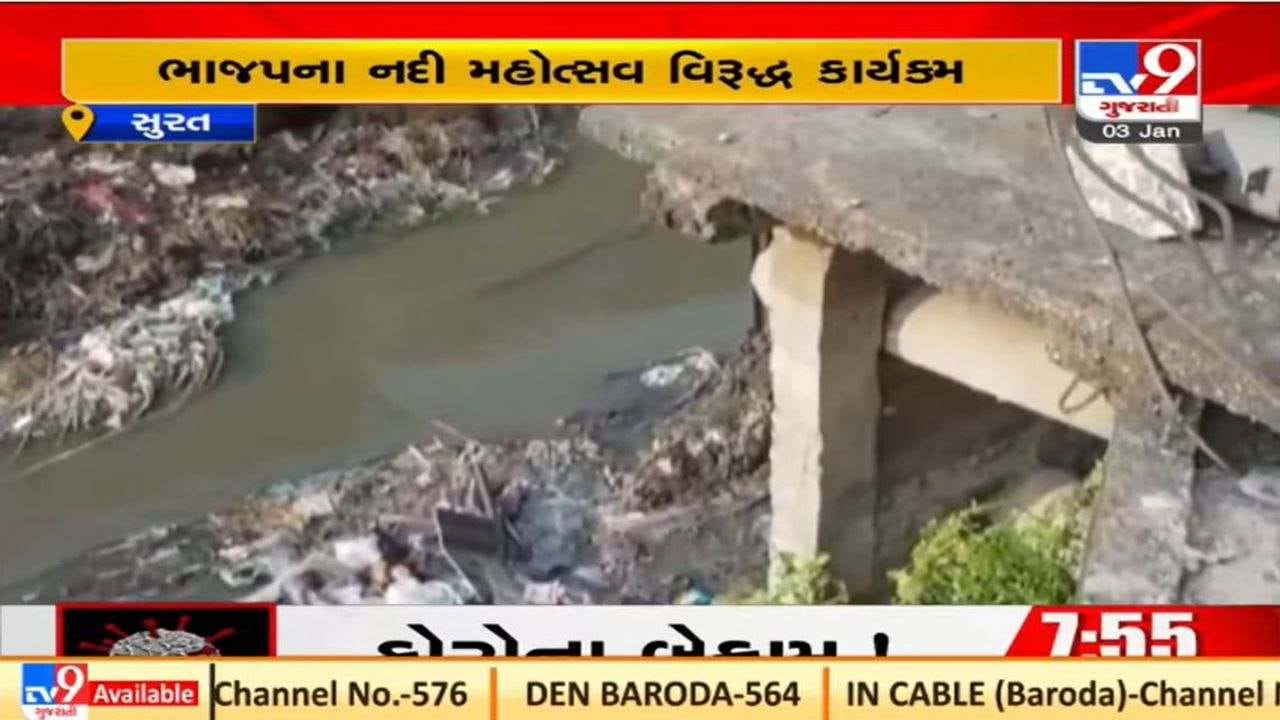 ગુજરાતમાં ભાજપ દ્વારા ઉજવવામાં આવેલા નદી ઉત્સવના વિરોધમાં સુરતમાં કોંગ્રેસે અનોખી રીતે વિરોધ કર્યો છે. જેમાં સુરત શહેર જિલ્લા કોંગ્રેસ સમિતિ દ્વારા નદી ઉત્સવના વિરોધમાં ખાડી ઉત્સવની ઉજવણી કરવામાં આવી છે. જેમાં શહેરમાં દુર્ગંધયુક્ત ખાડી શાસકોને ધ્યાને આવે અને લોકોને સુવિધાઓ મળે તે હેતુ કાર્યક્રમનું આયોજન કરવામાં આવ્યું હતું.
