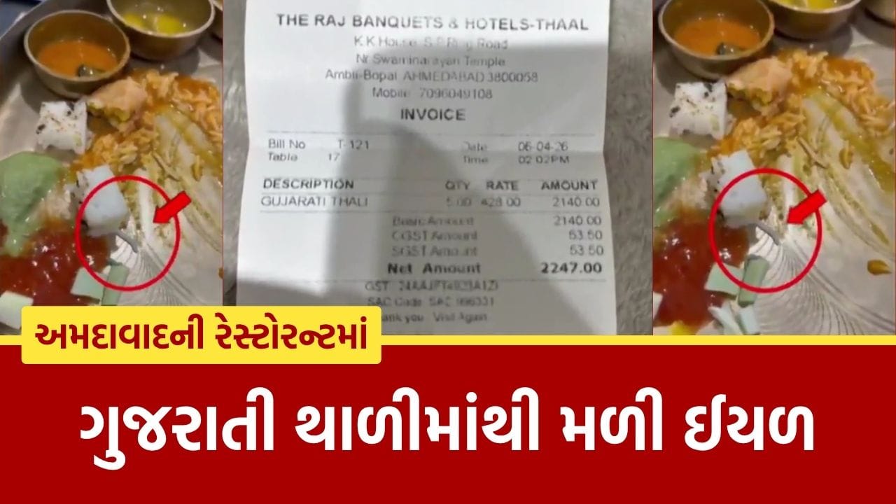 અમદાવાદના SP રિંગ રોડ પર આવેલા રાજ એન્ડ બેન્ક્વેટ રેસ્ટોરન્ટમાં ગુજરાતી થાળીમાંથી ઇયલ મળી આવી હતી.