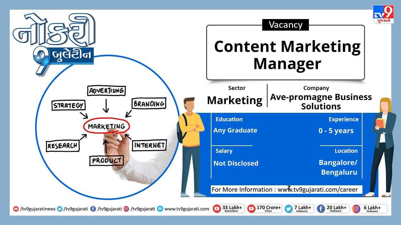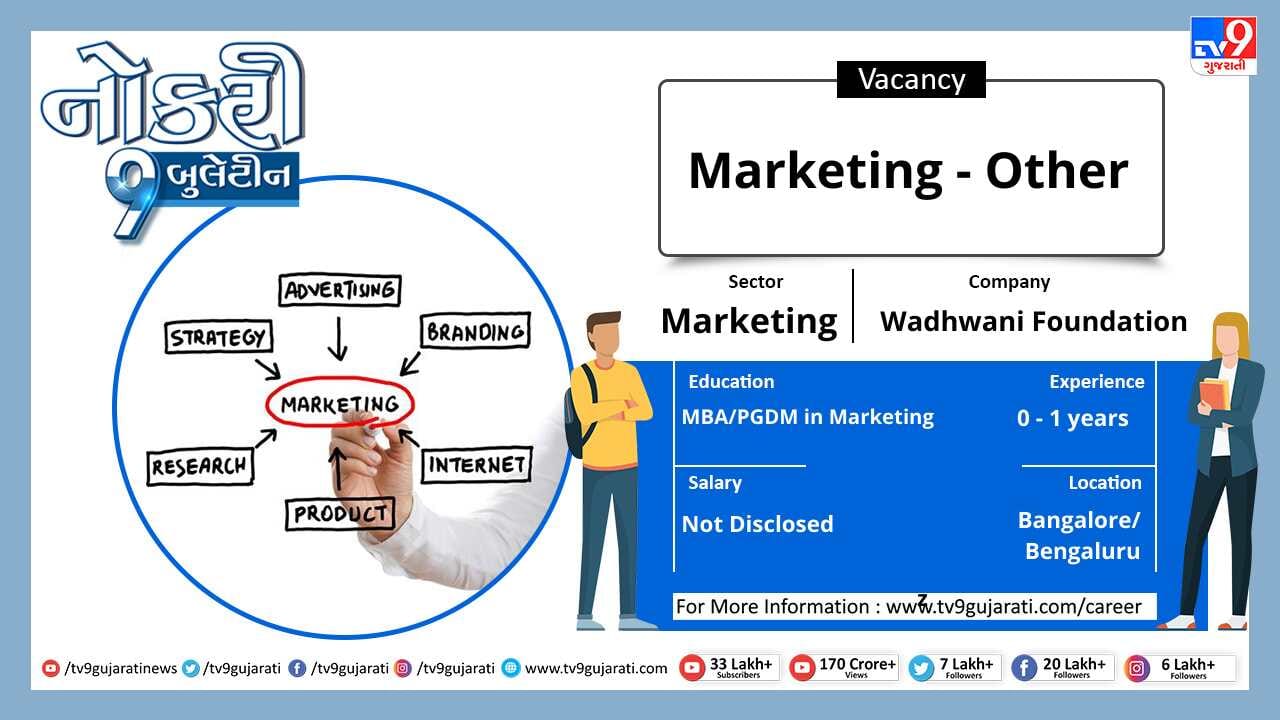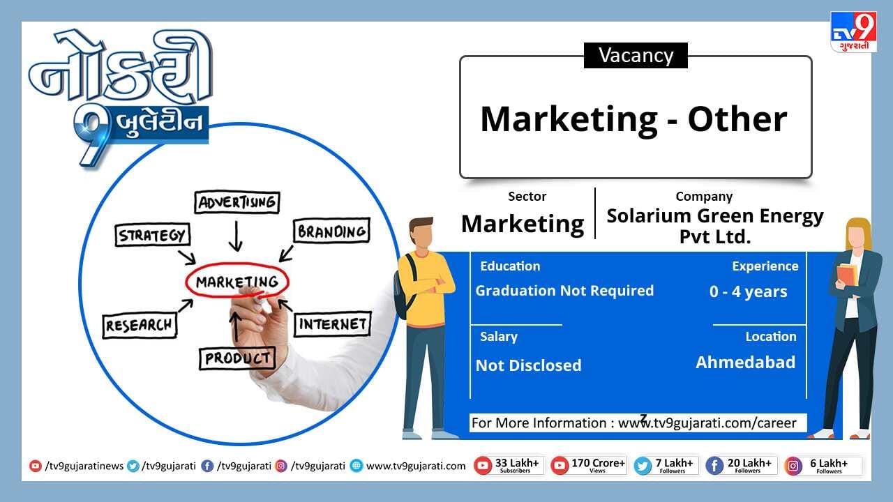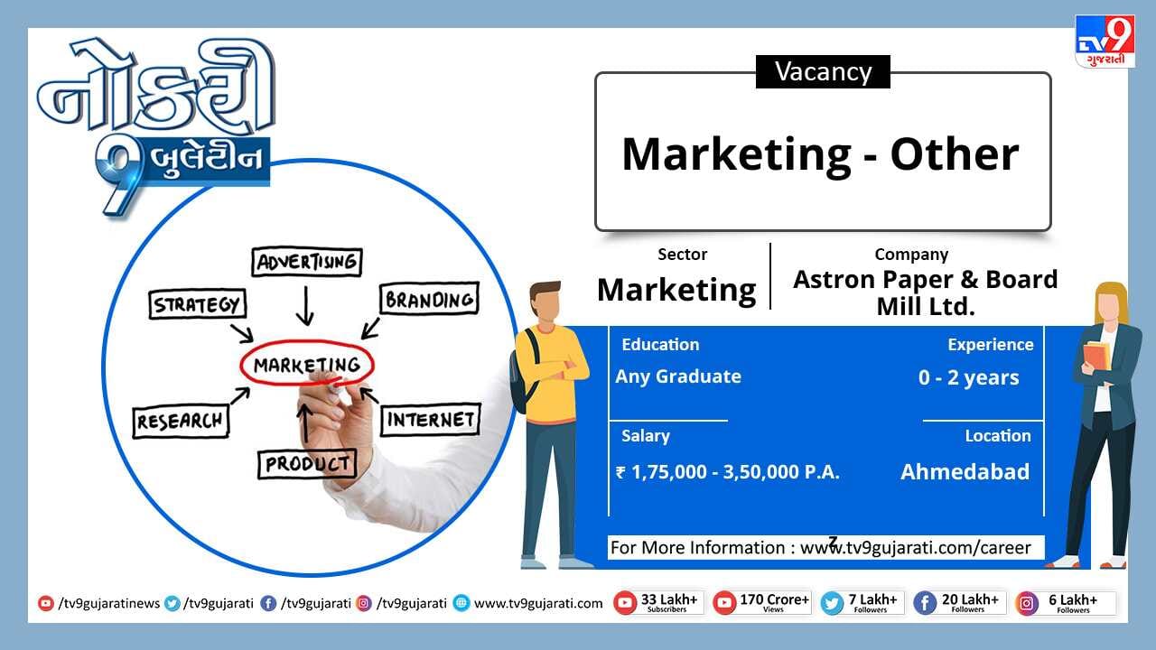સ્નાતક થયેલા લોકો માટે નોકરીની ઉતમ તકો (Job Vacancy) સર્જાઈ છે, માર્કેટીંગ ક્ષેત્રે નોકરી શોધી રહેલા ઉમેદવારો આ લીંક પર ક્લિક કરો. સ્નાતકોને મહિને 40,000થી વધુ પગાર મળશે.