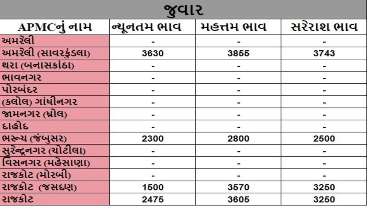 જુવારના તા.06-10-2022ના રોજ APMCના ભાવ રૂ.1500 થી 3855 રહ્યા.