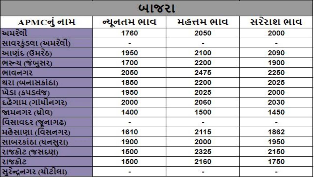 બાજરાના તા.12-10-2022ના રોજ APMCના ભાવ રૂ.1400 થી 2475 રહ્યા.