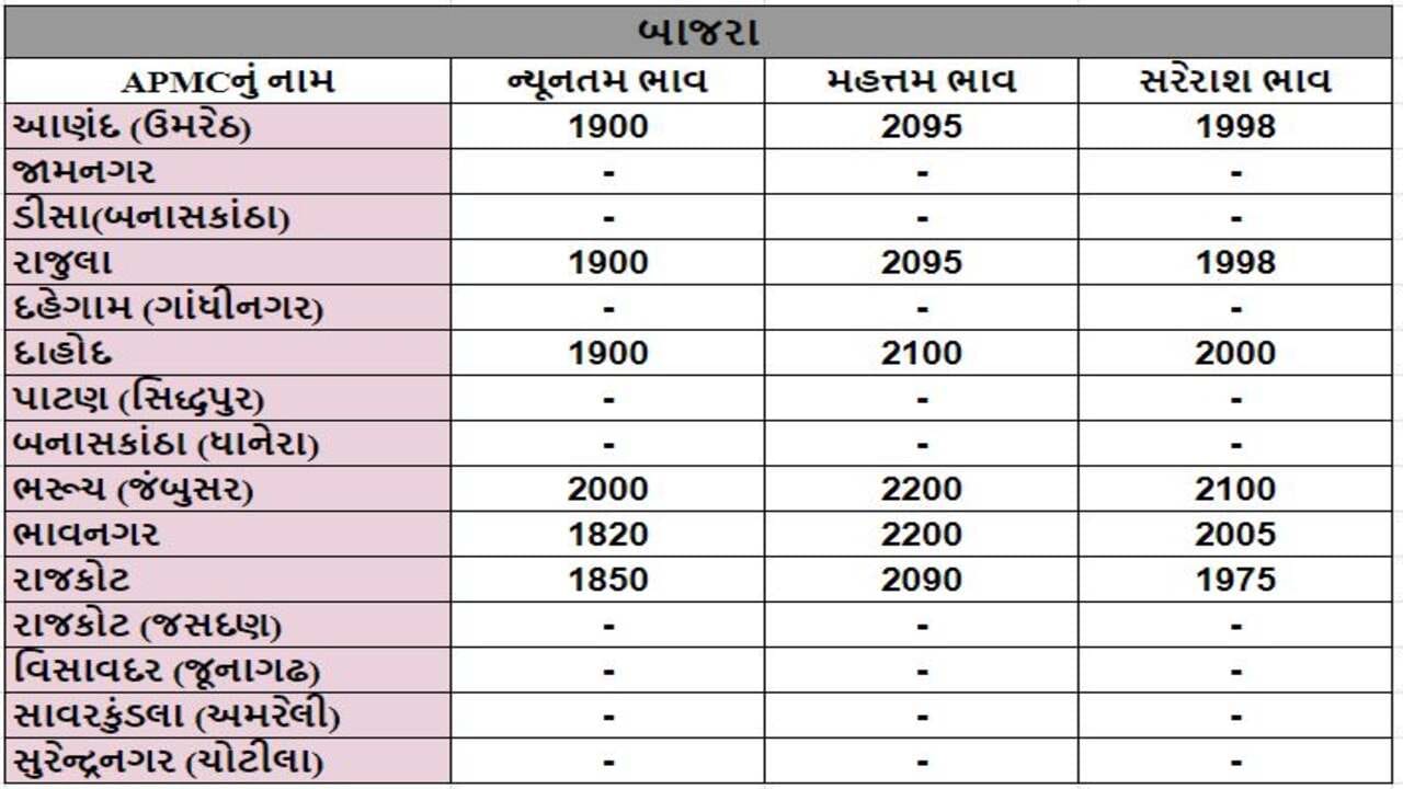 બાજરાના તા.29-09-2023ના રોજ APMCના ભાવ રૂ.2000 થી 2200 રહ્યા.