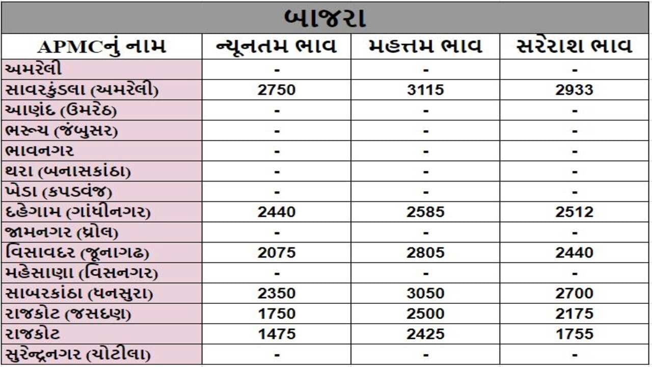 બાજરાના તા.04-04-2023ના રોજ APMCના ભાવ રૂ.1475 થી 3115 રહ્યા.