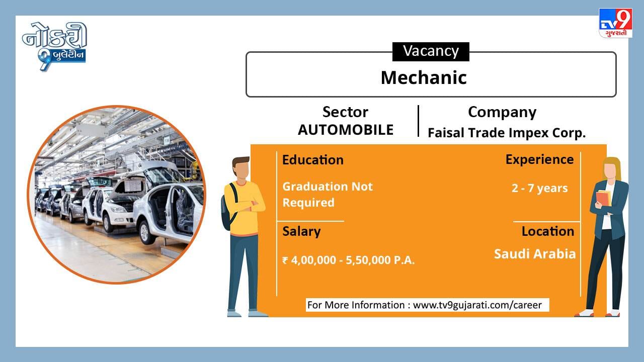 ધોરણ 10 કે 12 પાસ કે સ્નાતક થયેલા લોકો માટે નોકરીની ઉતમ તકો (Job Vacancy) સર્જાઈ છે, ઓટોમોબાઈલ ક્ષેત્રે નોકરી શોધી રહેલા ઉમેદવારો આ લીંક પર ક્લિક કરો. ધોરણ 10 કે 12 પાસ લોકોને મહિને 25,000થી વધુ પગાર મળશે.