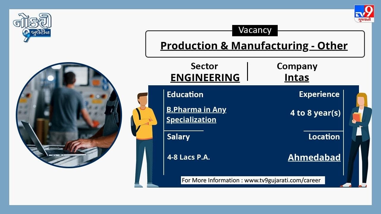 Ahmedabad: ધોરણ 10 કે 12 પાસ કે સ્નાતક થયેલા લોકો માટે નોકરીની ઉતમ તકો (Job Vacancy) સર્જાઈ છે, એન્જિનિયરિંગ ક્ષેત્રે નોકરી શોધી રહેલા ઉમેદવારો આ લીંક પર ક્લિક કરો. સ્નાતકોને મહિને 2,50,000થી વધુ પગાર મળશે.